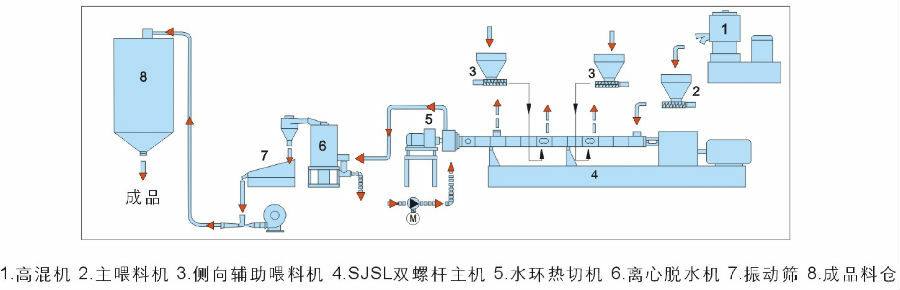 1、EVA、SBS類彈性體造粒機(jī):EVA、SBS類具有優(yōu)異的回彈性能,廣泛用于各類包裝、建筑、工具、密封等產(chǎn)業(yè)中。通過(guò)雙螺桿混煉造粒后更具有各種優(yōu)異的特殊性能,采用水環(huán)模面或水下切粒方式是其理想的選擇。